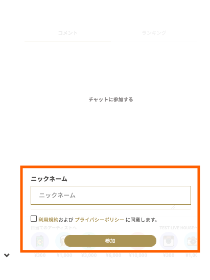 まずは配信画面のニックネーム入力欄に好きな名前を入力し、利用規約に同意して、"参加" をタップしてください。(ニックネームはチャットの発言者名として表示されます。)