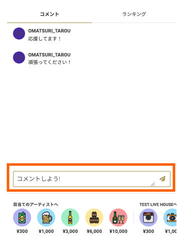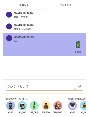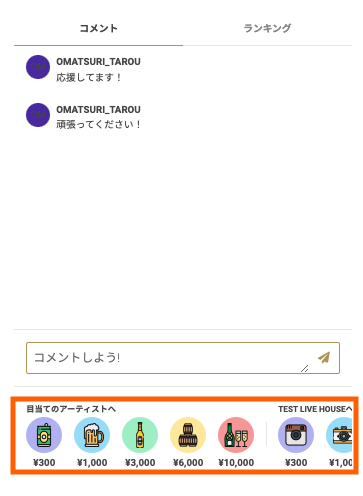 チャット画面下にある、スタンプの中から送りたいスタンプをタップします。(出演者、または会場から送る相手を選択できます。)